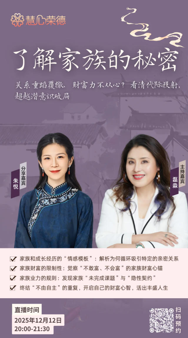 ● 在事业爬坡期或瓶颈期,感到迷茫、疲惫,不确定自己的价值仅仅等同于KPI和薪资? ● 积累了一定财富,却依然焦虑不够多、在想要与应该之间挣扎? ● 想挣钱,但内在似乎有个声音说太难了、别冒险? ● 渴望深度的关系,却在靠近就害怕受伤、独立却深感孤独中摇摆? ● 在职场中表现出色,却偶尔感到“这不是我真正想要的”,或在人际关系中感到消耗? ● 为什么有些人似乎天生好运,而有些则困在相似的困境里? ...... 每个人的关系、财富、人生抉择,从来不是“你一个人的事”:它们起源于你的成长经历刻、缠绕了家族未完成的“业力”课题、暗合着家族传承的“隐形”规则、浸泡在社会文化的熏陶里。 文化动力心理视角看那些让我们“重复的现实” 相似的感情卡点、财富困局、事业迷茫, 从来不是“命运或缘分的捉弄”, 而是自我觉醒的“信号”。 本场直播中: ✅ 觉察财富“心锚”:找到那个“不敢富、不会富”的内在卡顿,开启“敢富会富”的潜能、智慧管理财富。 ✅ 梳理情感“模板”:看到在关系里“不由自主”的重复,解锁爱的能力,让爱自然流动。 ✅ 透视“业力”:理解家族规则的牵引,转化家族能量的加持方向,借家族资源破局。 ✅ 启动“自我觉醒”:从很多身不由己、迷茫的线索到主动选择的觉醒,活出内心有力量的自己。 12月12日(周五)晚8点,锁定【慧心荣德直播间】 嘉宾阵容 ● 主持嘉宾:磊淼老师 慧心荣德资深心理咨询师 国家二级心理咨询师 中国心理卫生协会注册心理咨询师 18年+专业心理咨询经验,深谙中国式家庭系统动力 ● 分享嘉宾:朱悦老师 慧心荣德签约咨询师 / 国家二级心理咨询师 哲学博士 精神动力取向咨询师 | 个案经验9000+小时 资深团体带领者 | 团体带领2500+小时 国际儒学联合会(ICA)个人会员 师承著名心理学家薛伟、邹政老师 融合心理学、哲学与文化/视角,带你穿透家族迷雾 所有现实困局,家族脉络里都有“折痕” 看清来时路,收获破局方向