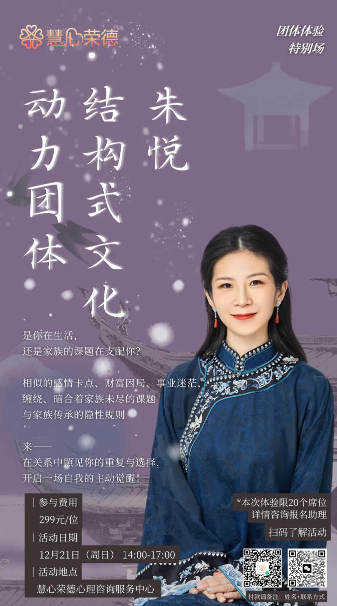 适合这样的你: 时间|12月21日(周日)14:00-17:00 安贞 |慧心荣德心理咨询服务中心 跳出卡点,夺回主导权的3种方式: “看见,是改变的开始” 在这里,你不是独自面对—— 会比你一个人的看得更清晰。 成员招募|感情卡点、财富困局、事业迷茫?看清代际投射,开启一场自我的主动觉醒
