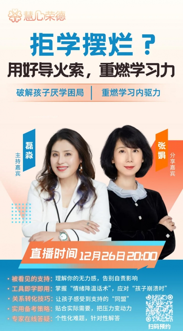 本场直播中,你将收获: ✅ 被看见的支持:你的“无力感”被真正理解,告别因自责而影响为孩子立规则的困境。 ✅ 即用工具:掌握“情绪降温话术”、应对“孩子崩溃时”的实用技巧,实用有效。 ✅ 关系转化:从“我觉得对ta好”的对抗模式,转向孩子能真切感受到支持的“同盟”模式。 ✅ 备考支持:3步学会用贴合孩子需要的方式,帮ta把备考压力变动力,稳定状态、超常发挥。 ✅ 专家答疑:直播连麦,直面你家的个性化难题,针对性解答。 【直播时间】 【嘉宾阵容 】 ● 主持嘉宾 磊淼 慧心荣德资深心理咨询师 国家二级心理咨询师 中国心理卫生协会注册心理咨询师 18年+心理咨询经验 ● 分享嘉宾 张娟老师 慧心荣德资深心理咨询师 国家二级心理咨询师 家庭教育指导师 高级绘画治疗师 10年+深耕儿童青少年家庭领域 家长的“急”与孩子的“躺” 从一次“对”的托举开始 帮孩子找回学习劲头、重拾信心 猜你喜欢: