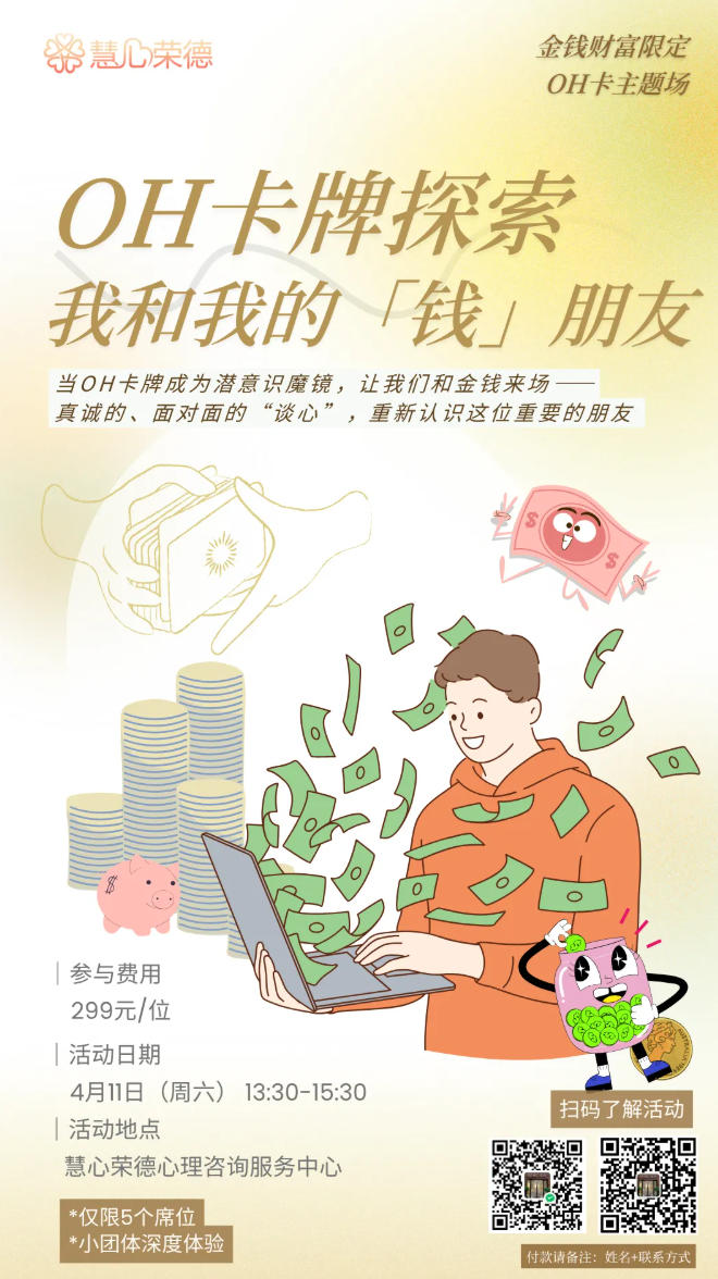 你是不是也这样? 想谈钱,又怕显得俗气; 想搞钱,又觉得疲惫空虚; 明明赚得不少,心里还是慌得一批; 和对象谈钱伤感情,不谈钱伤自己…… 我们总以为,缺的是赚钱的方法。 其实,我们缺的是和金钱“谈谈心”。 这个4月,我们用OH卡,玩点不一样的! 没有说教,没有KPI, 只有一群有趣的灵魂, 在故事和图像里, 照见你和“钱朋友”的相爱相杀。 在这里,你可以: ✨ 用游戏的方式,看清你的“金钱潜意识” ✨ 聊聊那些藏在“红包”、“账单”背后的关系密码 ✨ 找到职业、亲密关系中那个被“钱”卡住的点 ✨ 带一个轻松的自己,和一份新的行动灵感回家 听听往期小伙伴怎么说: “太通了!找出了我财务自由前的一百种焦虑的终极解决方案哈哈!” —— 某品牌主理人 吉尔 “Get到了亲密关系当中,为啥总是遇见抠门男友的答案…” —— 某大厂经理 Sunny “原以为只是游戏,却发现卡牌太绝情——每张牌都抽在我的痛处,帮我发现藏在我心底的真实。”—— 参与卡牌活动后的 朱朱 “从焦虑担心 自信自在” 和钱钱朋友友好相处的2种方式: 1️⃣ 添加小助理,私信”钱朋友 ”立即锁定席位 2️⃣ 带上你的“搞钱搭子”一起同行(两人同行,可领取【个人情绪心理测试1份/人】) 详情咨询活动小助理:hxrd180803 本次“金钱朋友“探索名额,开放5席(为确保深度互动,仅开放微型场域) 安贞|慧心荣德心理咨询服务中心 4月11日(周六) 13:30-15:30|当OH卡牌成为潜意识魔镜,解锁自我设限的“金钱小怪兽” 这不是占卜不是塔罗 是经心理学验证的潜意识投射工具 带你完成一场科学又魔幻的自我探险